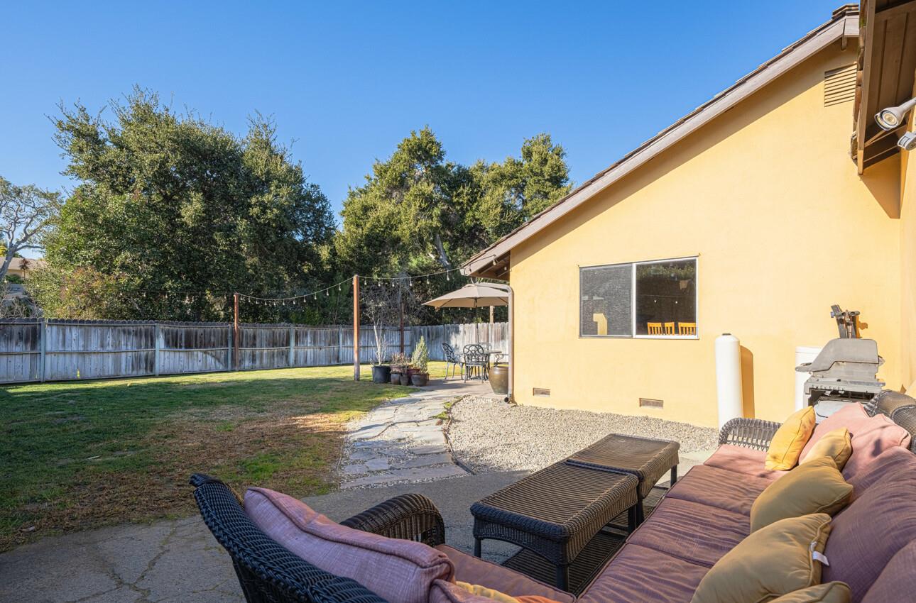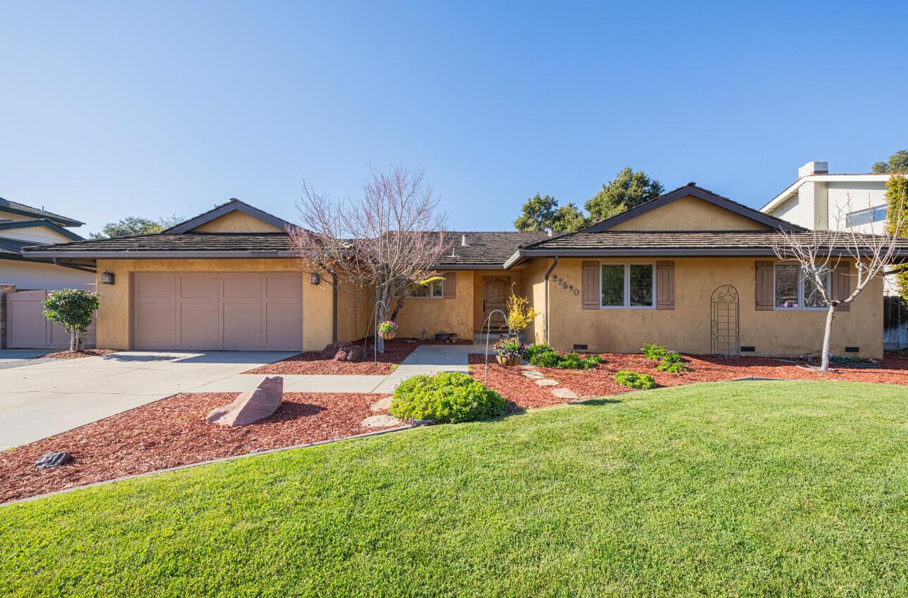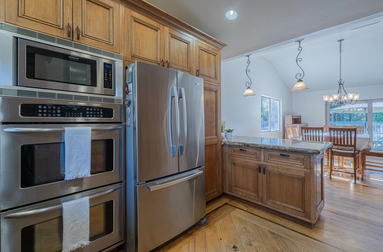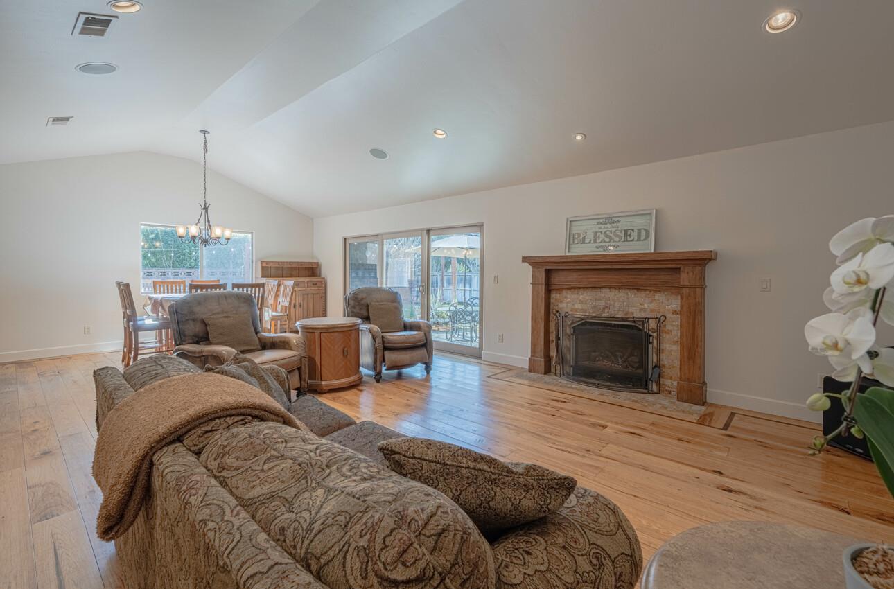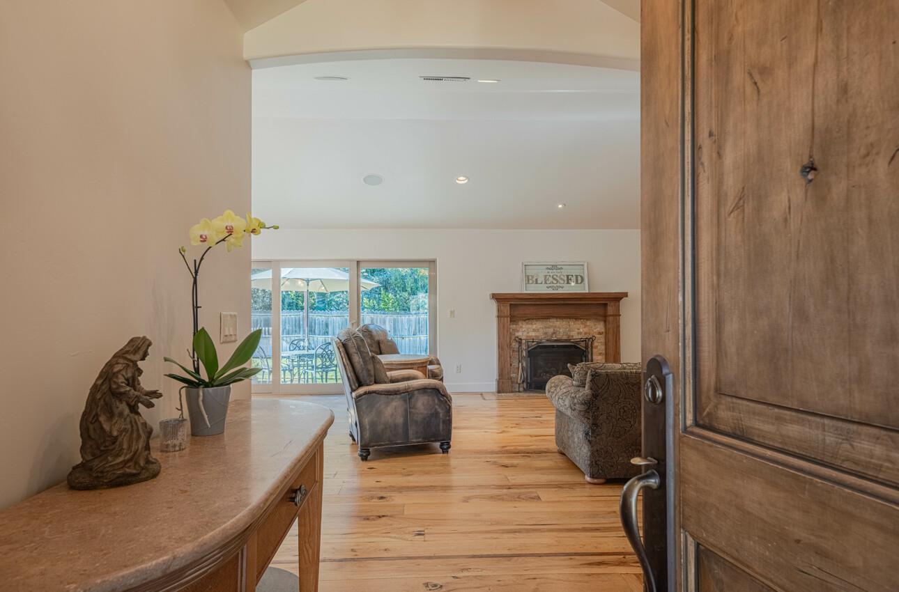 This charming single-level home features 4 bedrooms and 2 bathrooms, with a spacious 1,890 sq. ft. of living space. Set on a premium 9,891 sq. ft. lot adjacent to the former Fort Ord, 22590 Veronica Drive offers easy access to walking, biking, and hiking trails in the sunny Toro Park Estates neighborhood just outside the City of Salinas. The gorgeous kitchen is a chef's dream, complete with custom cabinetry, stone countertops, and stainless steel appliances, including a built-in double oven and a 5-burner gas stovetop. The open floor plan includes a spacious great room, equipped with professionally installed surround sound, a gas fireplace, and a vaulted ceiling, creating a warm and inviting atmosphere. The home features beautiful hardwood flooring throughout, and the interior was freshly painted. Both bathrooms showcase stunning natural stone finishes and vaulted ceilings, with the primary bathroom offering a walk-in shower with dual shower heads and a magnificent cast iron tub. Energy efficiency is boosted with solar panels, and the inviting backyard includes additional storage space on the side, ideal for outdoor activities. Experience the perfect blend of comfort and style in this thoughtfully designed home.